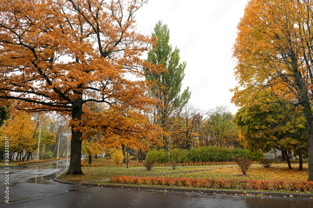 beautiful autumn nature background. landscape with autumnal tree in park, rainy day weather. fall time concept.