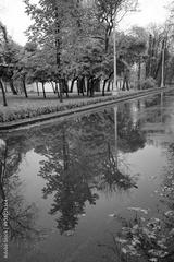 beautiful autumn nature background. landscape with reflection in puddle of autumnal tree in park, rainy day weather. fall time concept.