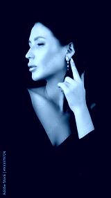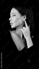 Elegant brunette with stunning earrings, set against a black background. Captures the beauty and sophistication of high-end jewelry.