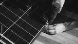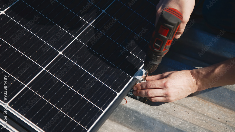 Installation, Connection and mounting of solar panels. Two workers fasten solar panels. Technicians installing solar panels on metal stand. Workers installing PV solar panels on the roof of a house.