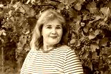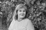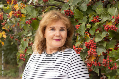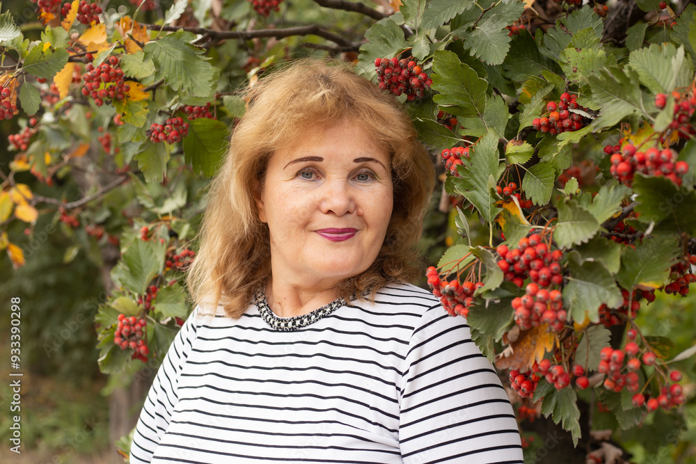 Portrait of happy smiling senior woman outside on sunny day in autumn park near rowan