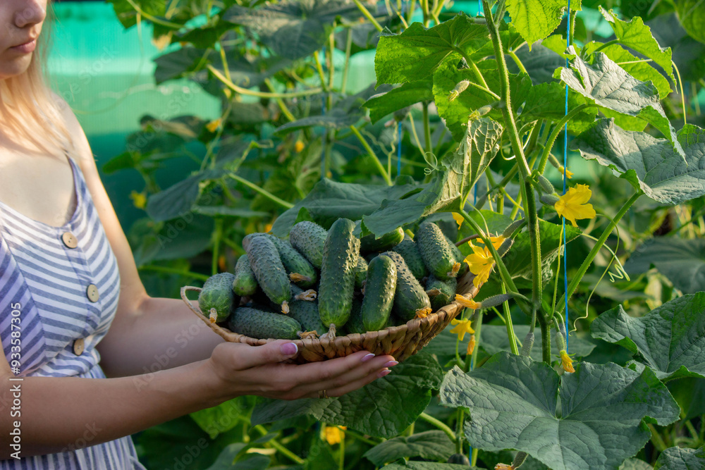 a female farmer collects cucumbers in a greenhouse. Selective focus