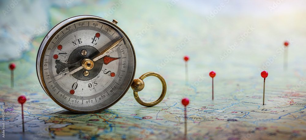 Magnetic compass and location marking with a pin on routes on world map. Adventure, discovery, navigation, communication, logistics, geography, transport and travel theme concept background..