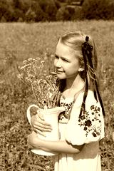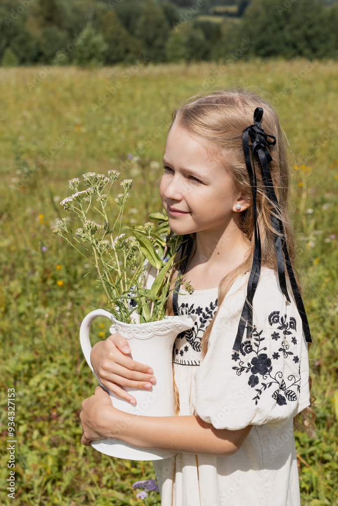 A little girl is picking flowers in a meadow into a jug, she is happy.