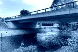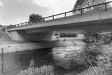 Reinforced concrete road bridge over the river. Close-up during sunny day in summer. Aerial view on a bridge across a small river. Canal or ditch with green grass meadow, Underneath of classic style