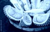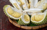 An opened durians arranging on wooden tray. Durian is a delicious tropical fruit native to Southeast Asia and is widely known as the “King of Fruits”.
