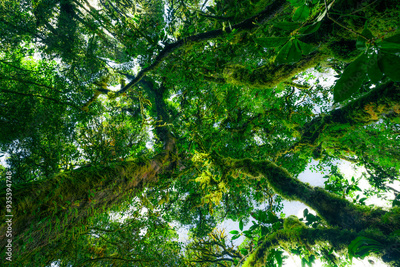 Looking up view of tree trunk to green leaves of tree in forest with sun light. Fresh environment in green woods. Forest tree on sunny day. Natural carbon capture. Sustainable conservation and ecology