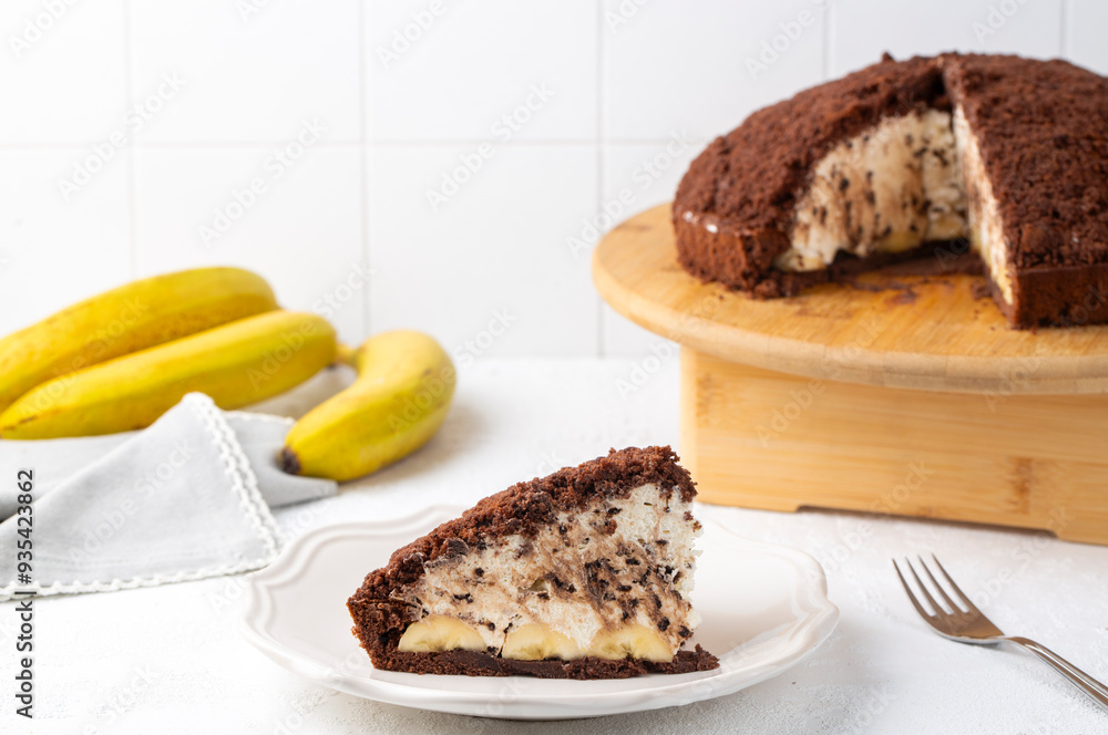 Homemade german mole cake with bananas, or maulwurfkuchen. Chocolate cake coat with crumbs, whipped cream. Turkish name; kostebek pasta