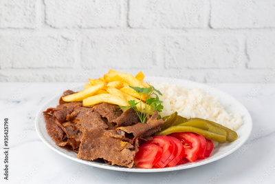 Meat doner menu, iskender menu on plate, turkish special meat doner, food, special menu (Turkish name; pilav üstü et doner)