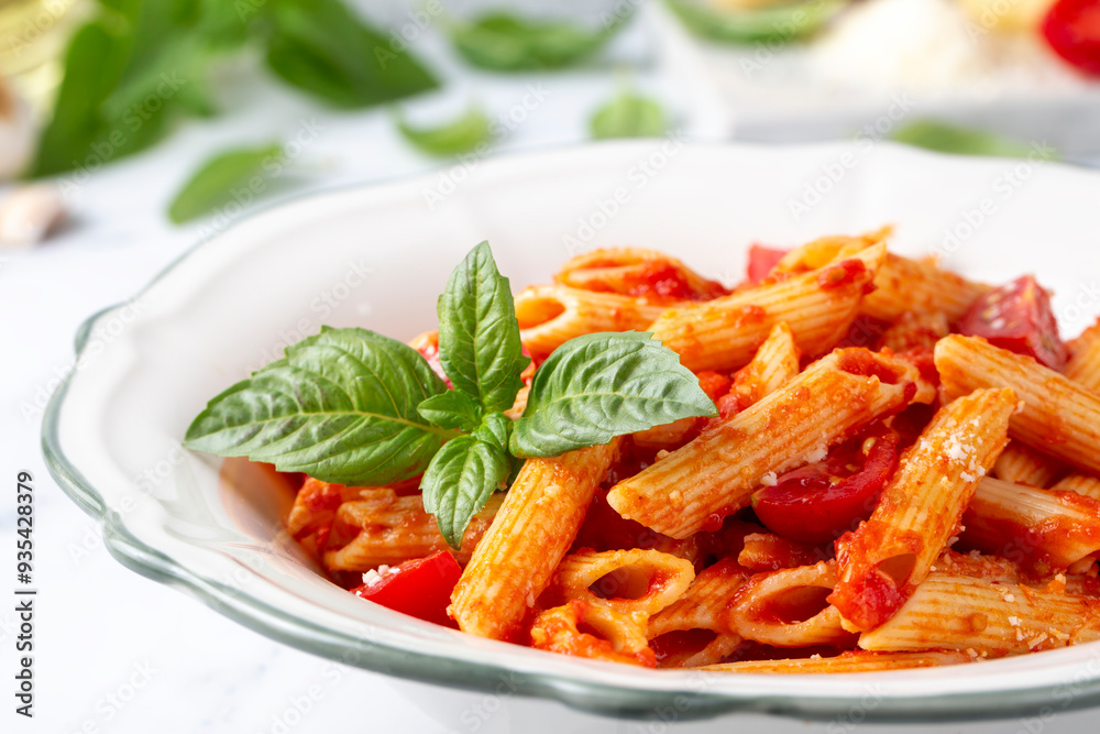 Classic italian pasta penne alla arrabiata with basil and freshly grated parmesan cheese on dark table. Penne pasta with chili sauce arrabbiata.