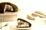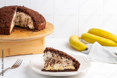 Homemade german mole cake with bananas, or maulwurfkuchen. Chocolate cake coat with crumbs, whipped cream. Turkish name; kostebek pasta