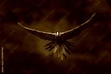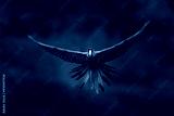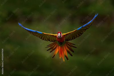 Macaw rare form Ara macao x Ara ambigua, in tropical forest, Costa Rica. Red hybrid fly parrot in forest. Wildlife in tropic forest. Parrot flying in dark green vegetation.