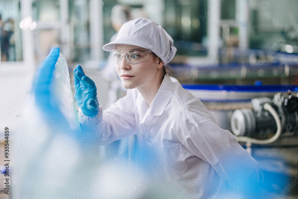 Women worker focus working care quality control in Drinking water factory. Production line inspector drink water bottle conveyor belt.
