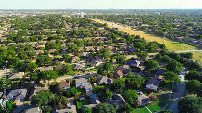 Aerial view suburban neighborhood near open space trail, concrete pathway with overhead utility right-of-way high voltage power lines in West Plano, downtown skyline background, suburbs Dallas