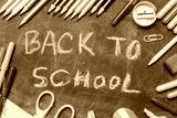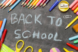Back to school concept with variety of office and school supplies on black chalkboard background.