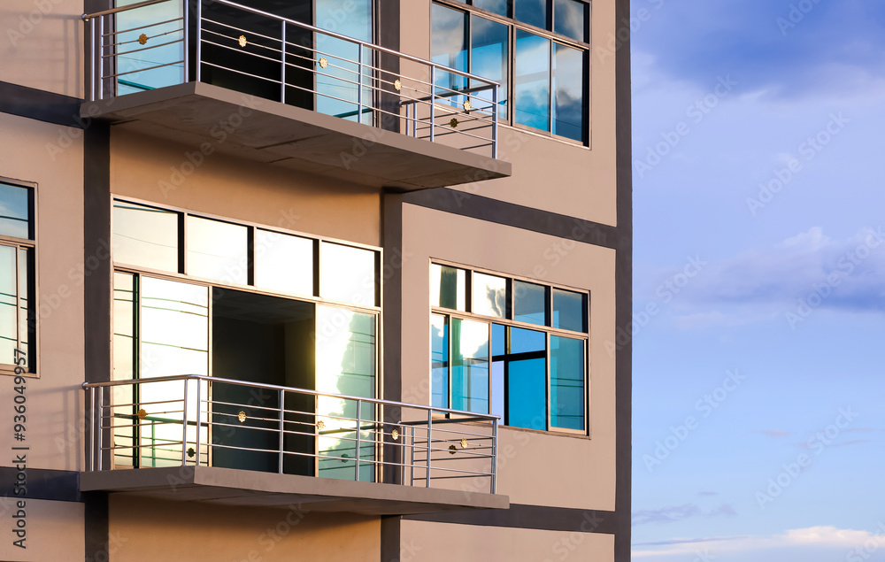 Modern office or residential building with glass door, window and balcony on brown cement wall against blue evening sky, side view with copy space