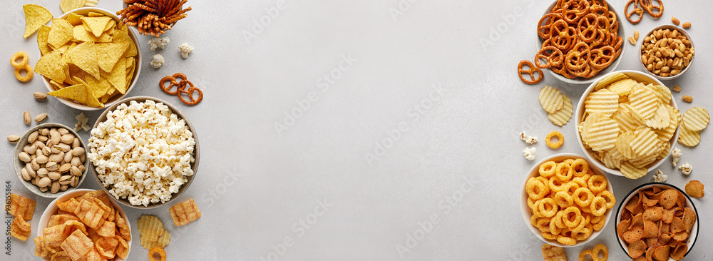 Set of many bowl with different salty snacks. Chips, popcorn, nuts, nachos and pretzels