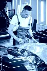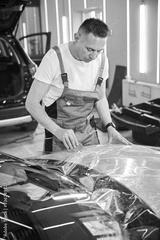 Master glues the protective film on the car