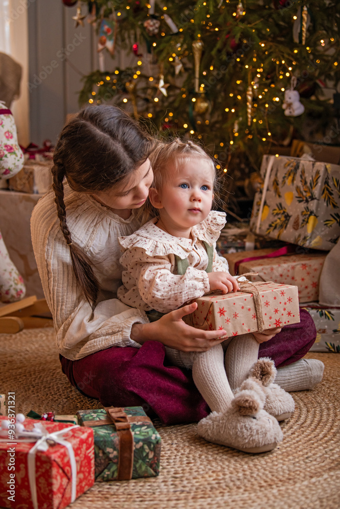 Two sisters sitting next to a Christmas tree and gifts in a country house interior.