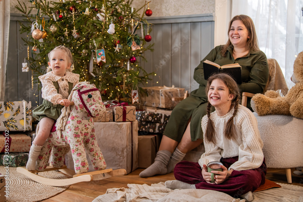 family relaxes together in the interior of a country house against the backdrop of a Christmas tree.