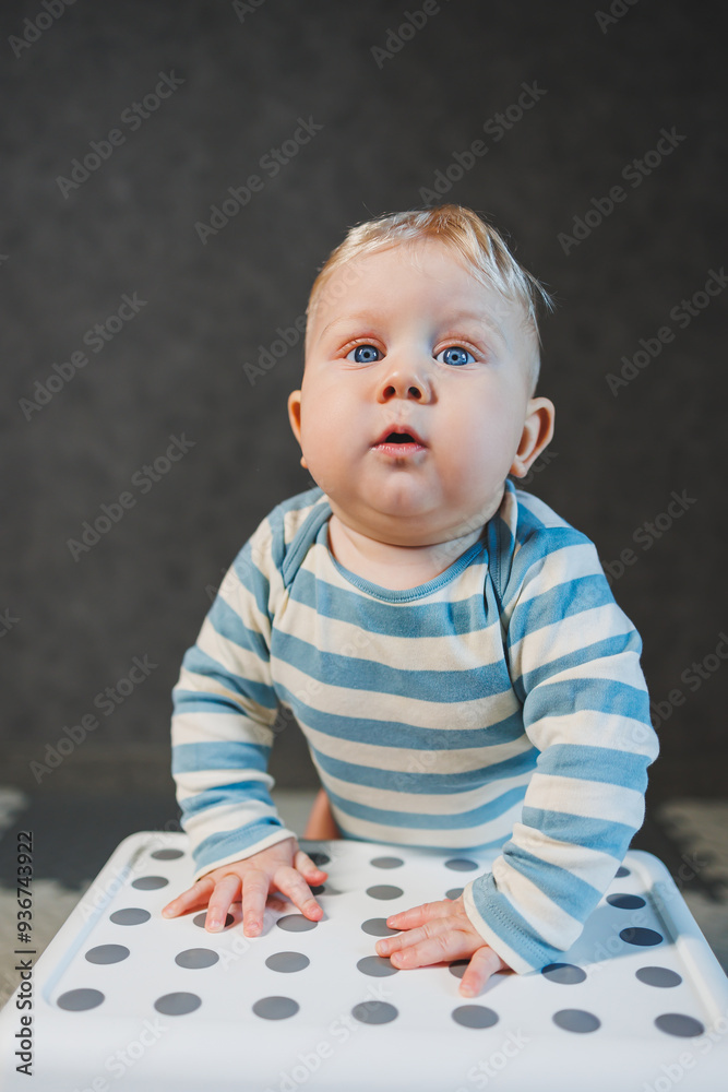An 8-month-old boy in a bodysuit is learning to stand near a support. Little boy trying to stand.
