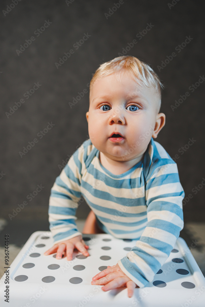 An 8-month-old boy in a bodysuit is learning to stand near a support. Little boy trying to stand.
