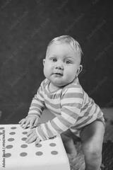 An 8-month-old boy in a bodysuit is learning to stand near a support. Little boy trying to stand.