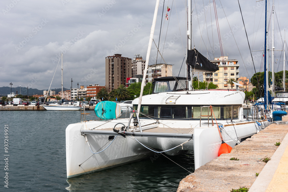 A close-up of a catamaran yacht moored in the marina of Olbia, Sardinia. In the background, the cityscape stretches along the waterfront.