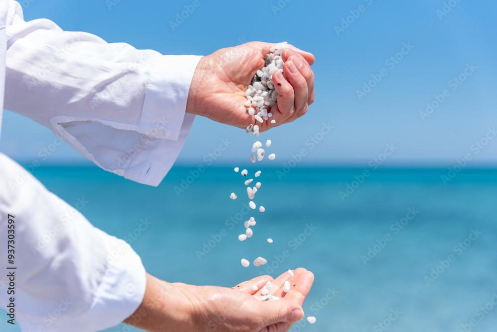 An intimate moment of reflection and connection with nature, as pebbles gently flow from hand to hand, symbolizing the passage of time and the simplicity of life's fleeting moments.
