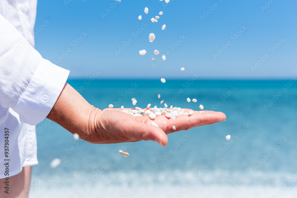 A serene moment: a woman’s partially visible hand catching small beach pebbles as they fall, with a blurred sea and sky merging at the horizon in the background.