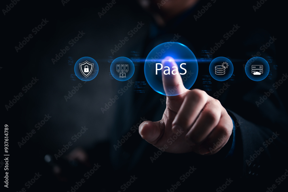 businessman interacts with PaaS technology icons, focusing on secure cloud computing solutions. Suitable for IT and business technology promotions.