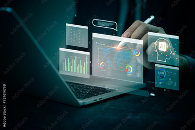 Businessman uses advanced AI-driven data analytics tools on a virtual screen, highlighting digital transformation. Perfect for tech, data, and business intelligence marketing.