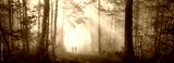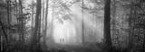 Two people walking in the dreamy magic of a beautiful forest in autumn. With sun rays falling through golden mist, a panoramic view with tranquil atmosphere