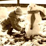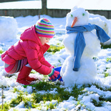 Happy little girl playing in winter. Cute kid making snowman in the garden at the backyard of the house. Child having fun outdoors.