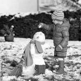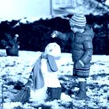 Happy little girl playing in winter. Cute kid making snowman in the garden at the backyard of the house. Child having fun outdoors.