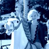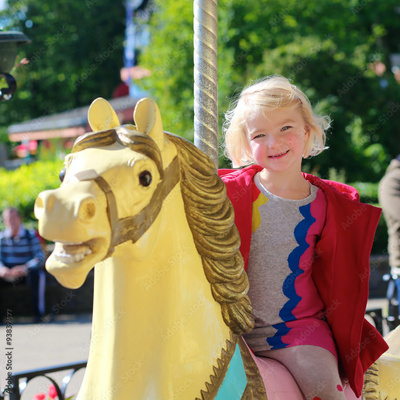 Happy little girl enjoying a ride on the merry-go-round. Cute toddler kid having fun at funfair. Family with kids spending day in amusement park