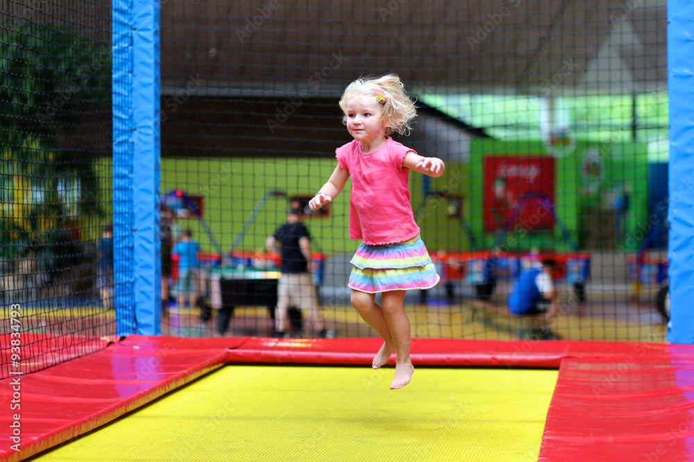 Little child jumping at trampoline in indoors playground. Active toddler girl having fun at sport centre.