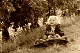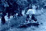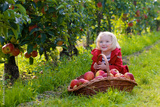 Little girl picking apples in a basket at the garden. Happy child playing in apple tree orchard on a farm in autumn. Healthy toddler having fun and eating fruits at fall harvest outdoors.