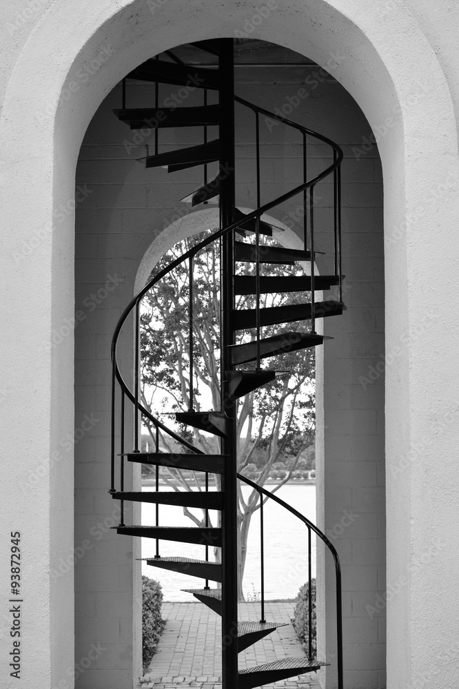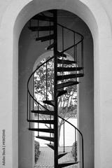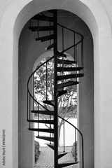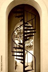 Black and white photo of tall metal stairs in a clock tower stairwell