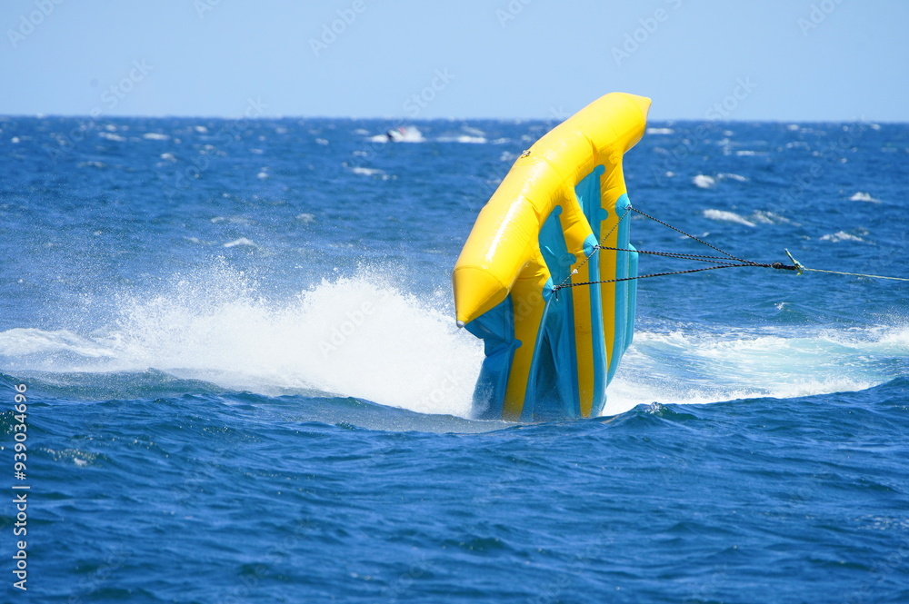 Parasailing with boat over sea in Barcelona in beautiful summer day. Tropical beach vacation.