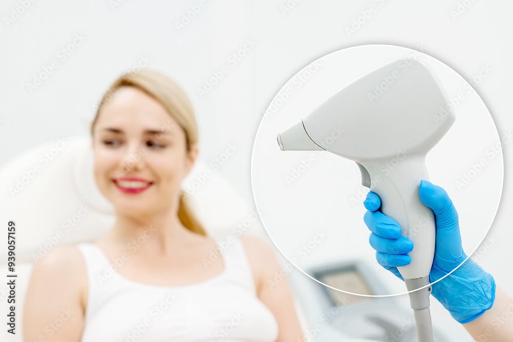 A young, happy woman in a modern laser hair removal clinic. She sits against a light background with a laser device handle visible nearby. Ideal for your advertising needs.