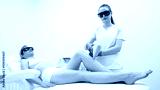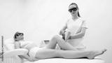 Laser hair removal for legs by a cosmetologist in a modern clinic. A young woman receives professional treatment for smooth, hair-free skin in a state-of-the-art aesthetic environment.