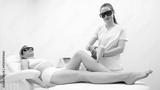 Laser hair removal for legs by a cosmetologist in a modern clinic. A young woman receives professional treatment for smooth, hair-free skin in a state-of-the-art aesthetic environment.