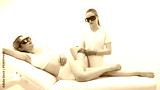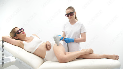 Laser hair removal for legs by a cosmetologist in a modern clinic. A young woman receives professional treatment for smooth, hair-free skin in a state-of-the-art aesthetic environment.