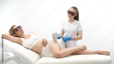 Laser hair removal for legs by a cosmetologist in a modern clinic. A young woman receives professional treatment for smooth, hair-free skin in a state-of-the-art aesthetic environment.
