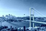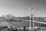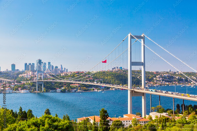 Istanbul Bosphorus Bridge or 15th July Martyrs Bridge with Istanbul panorama cityscape during summer sunny day. Istanbul, Turkiye.