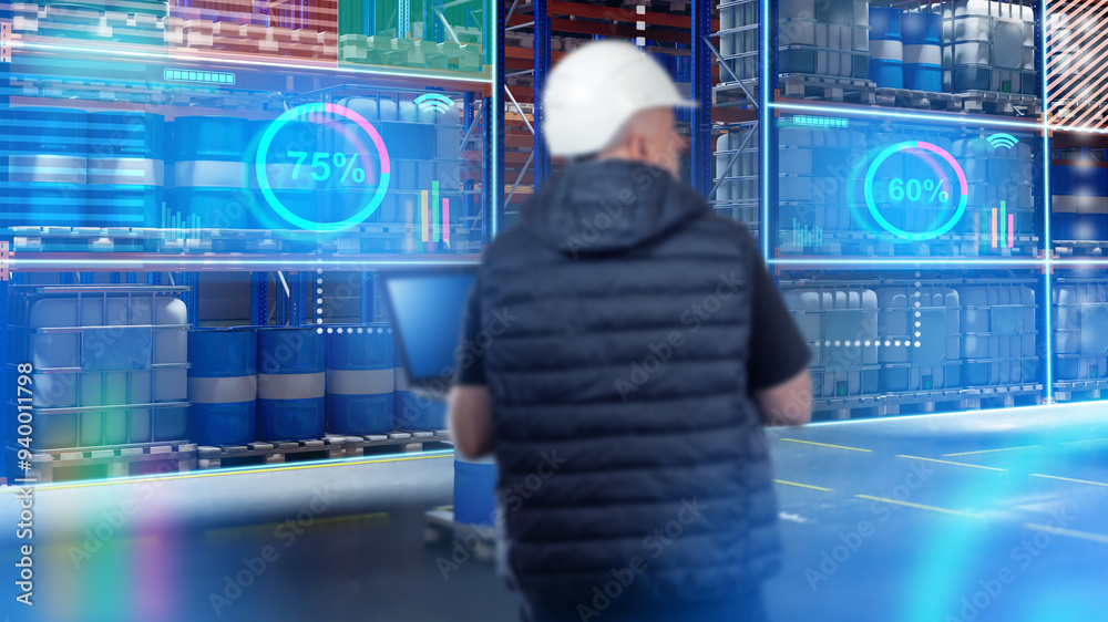 Man in modern warehouse. Futuristic logistics. Warehouse with virtual screens. Storekeeper back to camera. Warehouse worker with laptop. Man in high-tech storage hangar. Futuristic logistics center