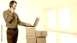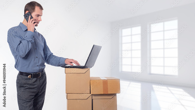 Business man moving to new office. Guy with boxes in empty room. Man speaks on phone while moving. Relocation to new apartment. Businessman is looking for place to move through laptop. Moving process
