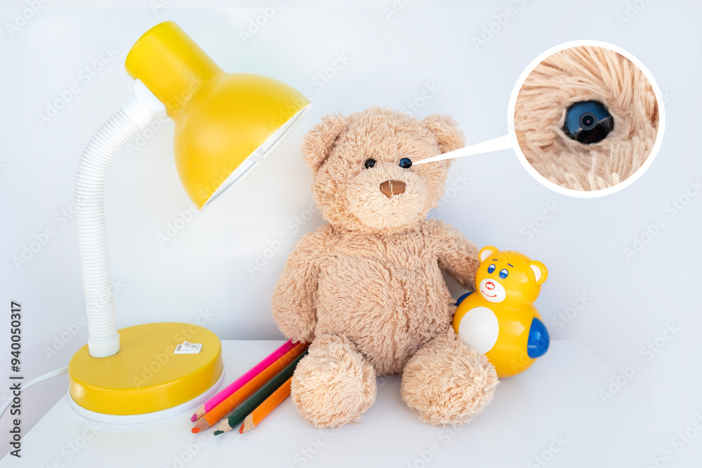 Tiny Miniature hidden surveillance camera embedded in teddy bear's eye for covert monitoring purposes, discreet surveillance in toy setups, covert operations, private surveillance