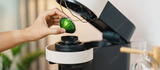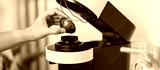 hand making Espresso Coffee by Coffee Maker Machine with Capsule of roasted coffee bean on wood table bar. Daily beverage drink at Home, Apartment and Office concept